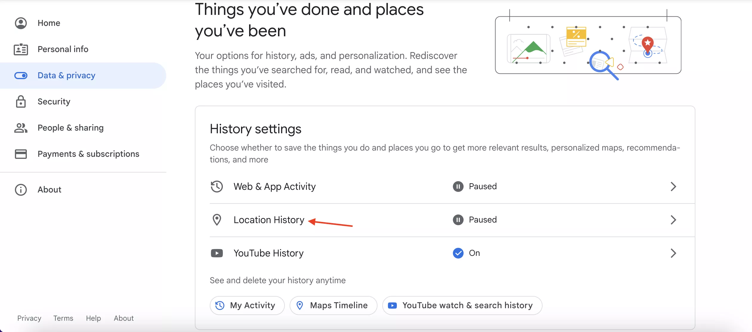 - 要查看每项特定服务的数据,请转到您做过的事情和去过的地方。通过选择每个服务旁边的箭头来管理和更改每个服务的设置。