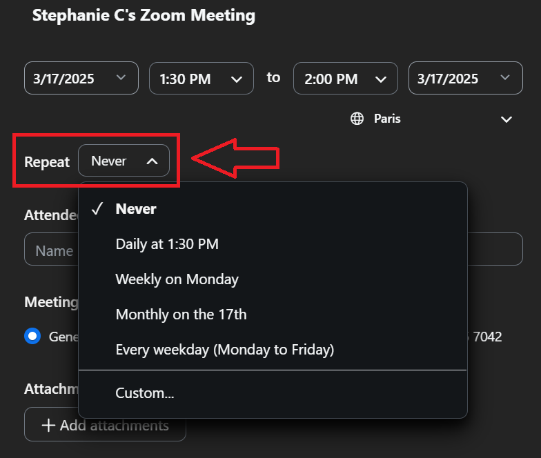 - 通过选择自定义重复周期(如果需要)“风俗”并设置会议重复的频率。如果选择每周,选择会议的具体日期。
