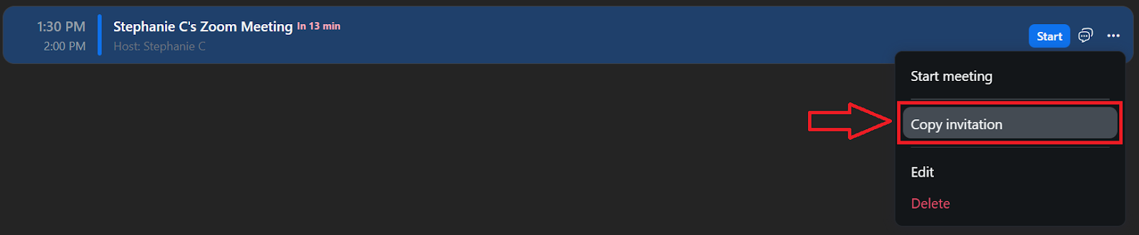 - 单击“会议”选项卡,找到会议,单击右侧的三点图标,然后选择“复制邀请函。”通过短信、电子邮件、Slack 或其他消息应用程序分享详细信息。