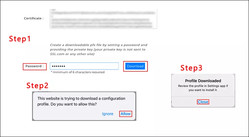 步骤3:然后为证书设置密码并点击下载。在弹出窗口中,点击允许供下载。下载后,点击关闭完成。