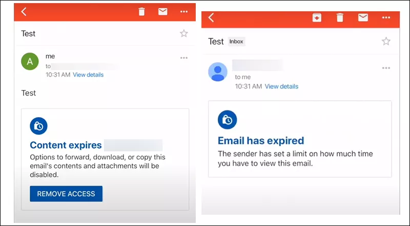 但是,在 Gmail 中,如果您设置了过期时间,则可以手动提前使其过期。只需输入您发送的电子邮件,然后点击删除访问权限按钮。这种方法可以帮助尽可能减少损失。
