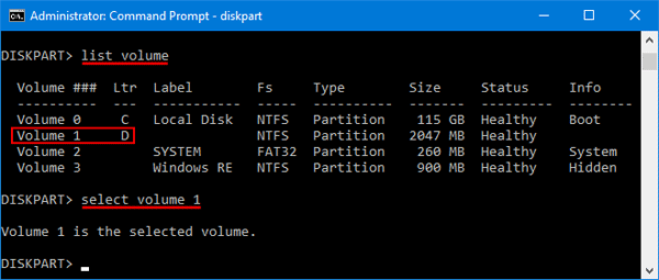 - 类型列表量并按 Enter 键。下一个类型选择音量#,其中 # 是您要将其锁定为只读的卷的编号。