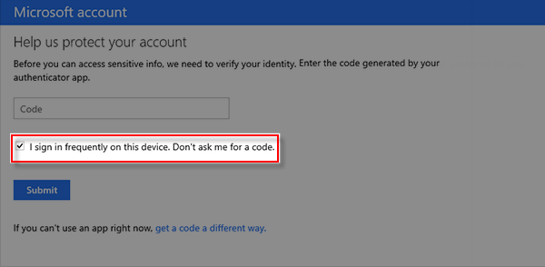 第 3 步:输入您收到的代码,然后选中复选框”我经常在此设备上登录。不要问我要代码。”。然后点击提交。