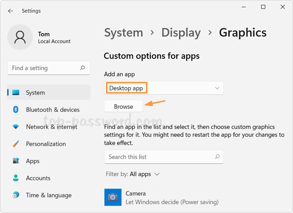 - 你将看到已安装的 Microsoft Store 应用程序的列表,你可以更改其显卡设置。要添加所需的桌面应用程序,请单击“添加应用程序”下的下拉列表,然后选择“桌面应用程序“,然后单击浏览按钮。