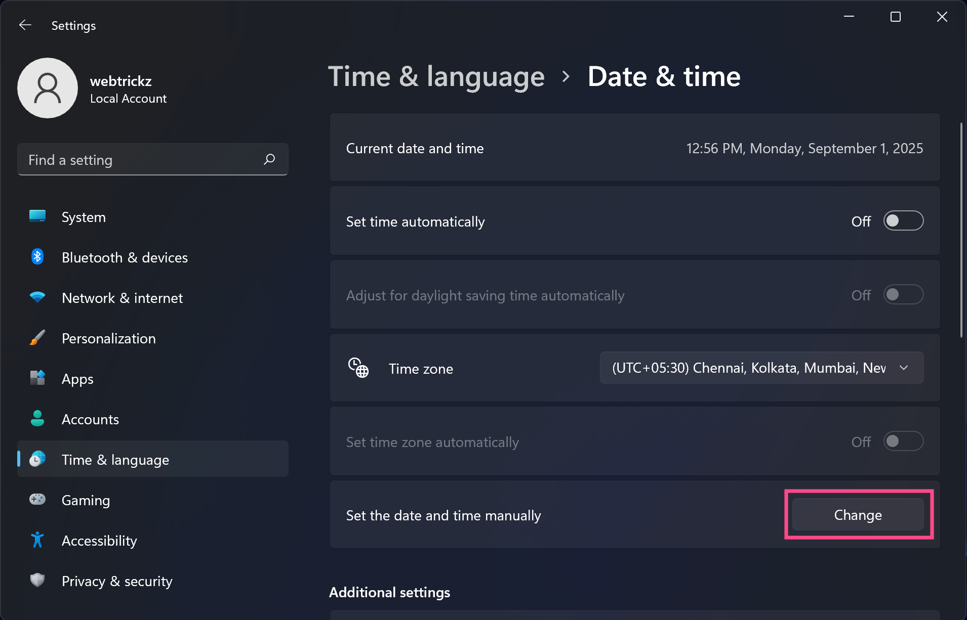 Win + I打开设置。 - 导航到时间和语言>日期和时间。