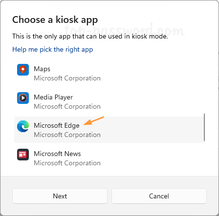 - 选择您想要在信息亭模式下运行的单个应用程序,然后单击下一个。