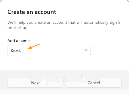 - 在弹出窗口中,输入您的自助服务终端帐户的名称,然后单击下一个。系统将创建一个具有有限权限的新本地帐户,并将其指定为自助服务终端帐户。