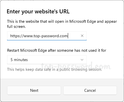 - 输入网站主页的 URL,并指定重新启动 Microsoft Edge 之前不活动的分钟数。点击下一个。