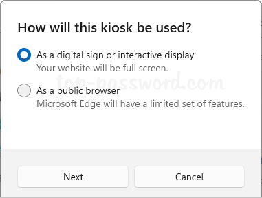 如果您选择使用 Microsoft Edge 作为展台应用,请选择以下选项之一了解 Microsoft Edge 的显示方式,然后单击下一个。