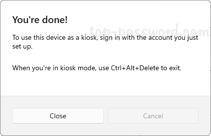注销您的主帐户,然后使用此 Kiosk 帐户登录,它将自动全屏启动您指定的 Kiosk 应用程序。要从自助终端帐户存在,您需要按控制键+替代+的键盘快捷键。