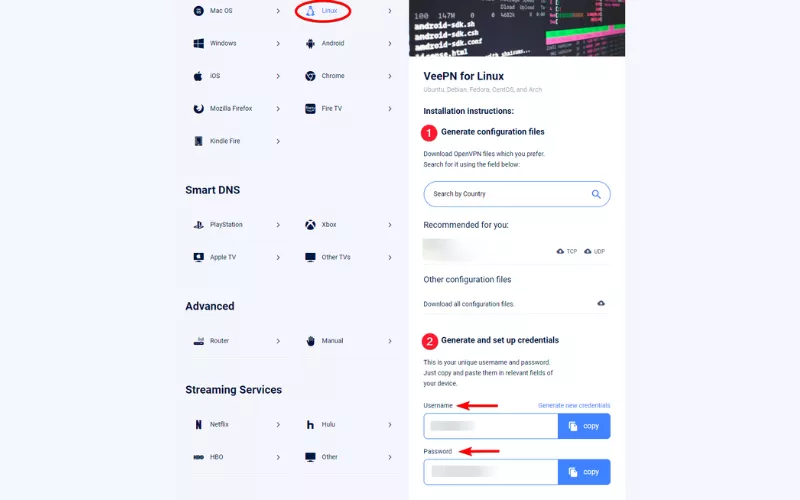 - 登录您的 VeePN 帐户并在设置新设备下选择 Linux。