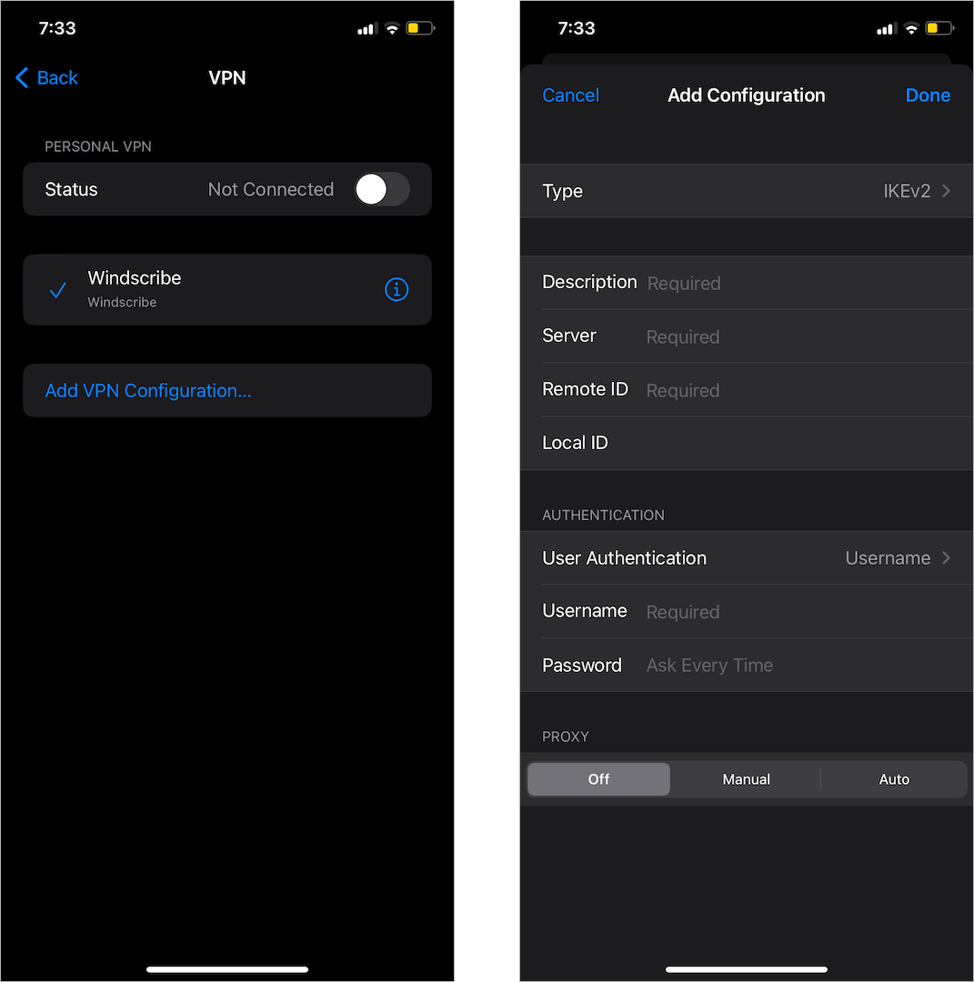 如果您不想从 App Store 下载 VPN,可以手动设置。要在 iOS 设备上配置 VPN,请转至设置 > 常规 > VPN 和设备管理 > VPN > 添加 VPN 配置。您需要在此处选择类型(IKEv2、IPSec 或 L2TP)并输入 VPN 提供商的服务器地址、远程 ID、用户名和密码等信息。添加所需的详细信息后,只需点击“完成”即可连接到 VPN。
