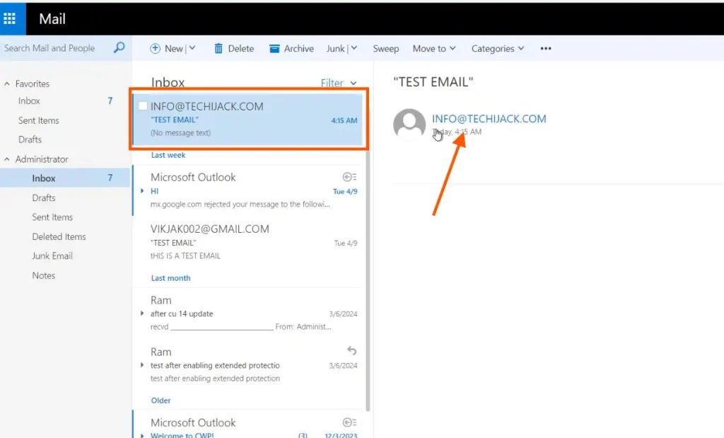 现在,如果我们去查看管理员的邮箱,我们可以看到我们收到了一封来自 info@techijack 的电子邮件,主题为测试电子邮件