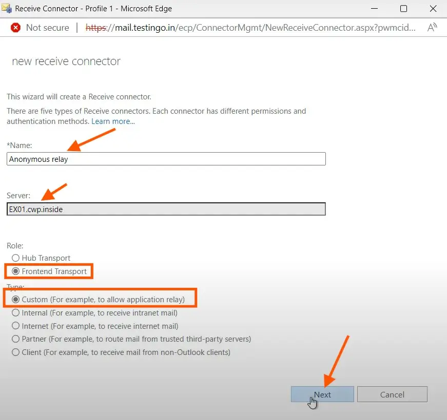 因此,我们将创建一个接收连接器来在 Exchange Server 2019 上配置匿名中继。