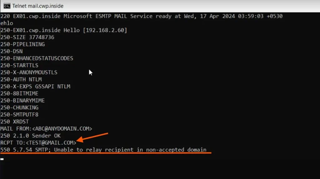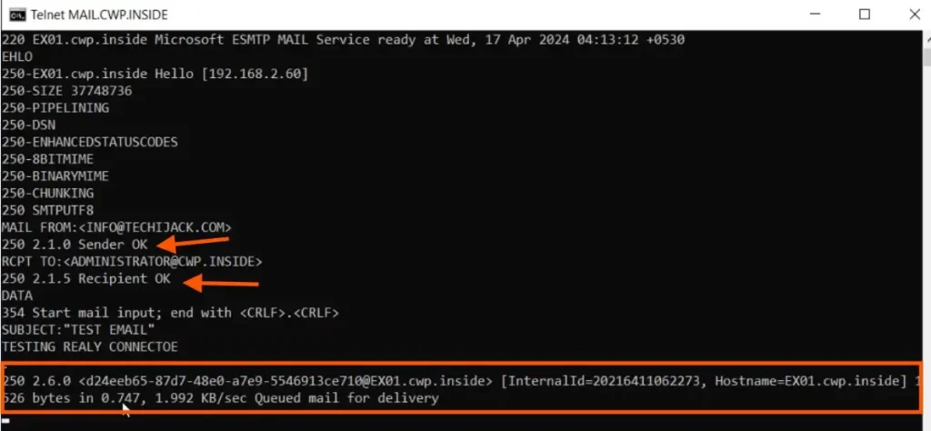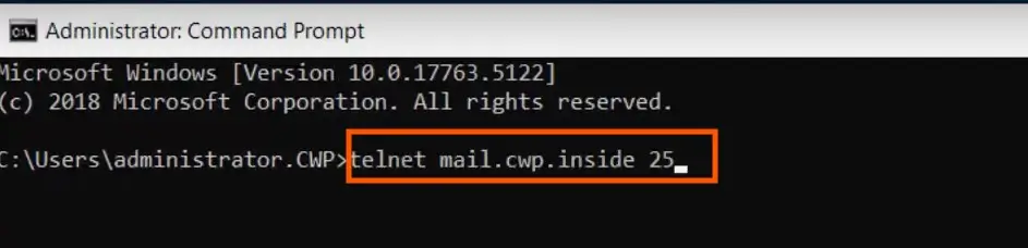 在我们的例子中,我们正在使用内部域,因此我们输入telnet mail.cwp.inside 25然后按回车键