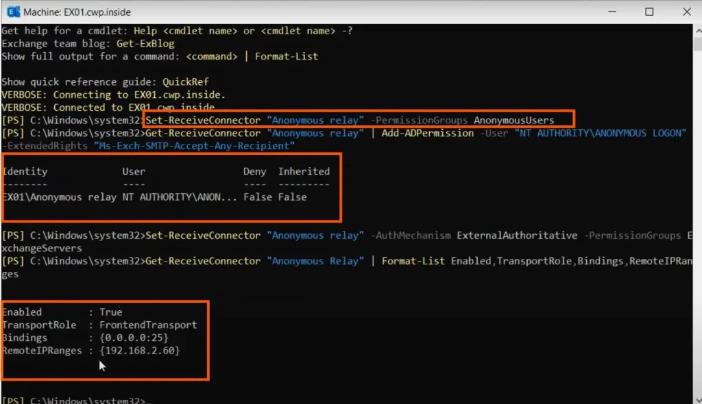 因此,我们已成功配置匿名 SMTP 中继,并设置了专用接收连接器的权限。