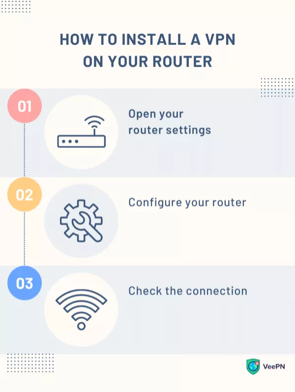- 检查连接。完成路由器配置后,就可以查看连接是否正常工作。如果您在这方面有任何问题,请随时联系 VeePN 的支持团队:[电子邮件受保护]或通过 VeePN 网站上的实时聊天。