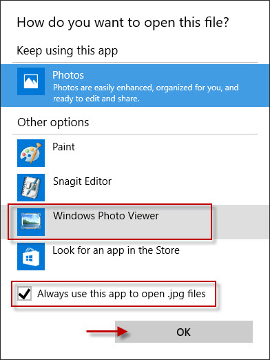 第 2 步:选择Windows 照片查看器选项,检查始终使用此应用程序打开 .jpg 文件,然后单击好的。 (如果在其他选项下看不到“Windows 照片查看器”,请单击更多应用找到它。)