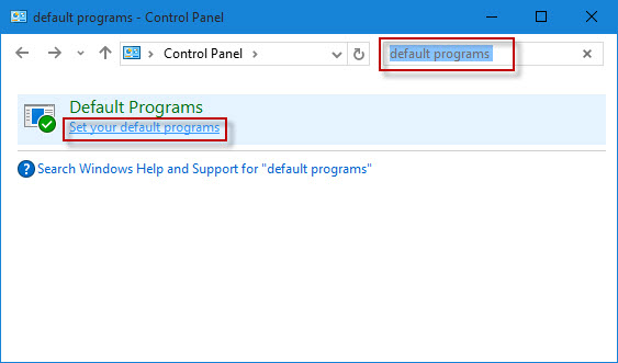步骤 1:打开 Windows 10 控制面板。类型默认程序在搜索框中。然后单击设置您的默认程序链接下默认程序。