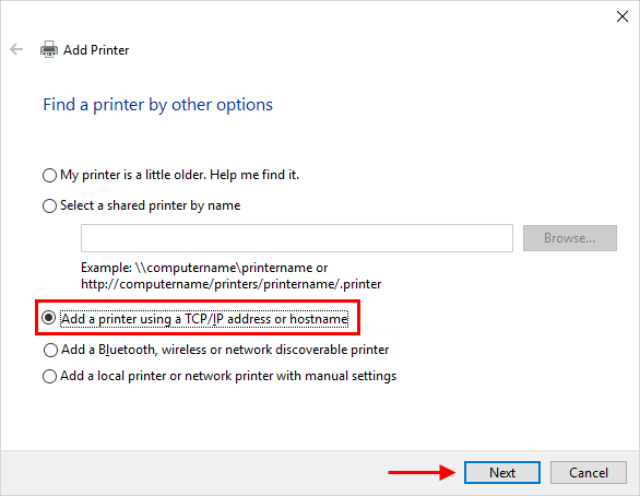 第四步:选择使用 TCP/IP 地址或主机名添加打印机然后单击下一个。