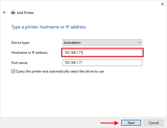 第五步:保留设备类型到自动检测并填写主机名或 IP 地址。确保查询打印机并自动选择要使用的驱动程序被勾选了,点击下一个。