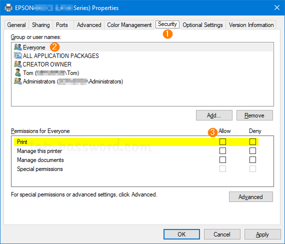 - 前往安全选项卡。您可以拒绝“每个人” 分组并向所需用户授予打印权限。