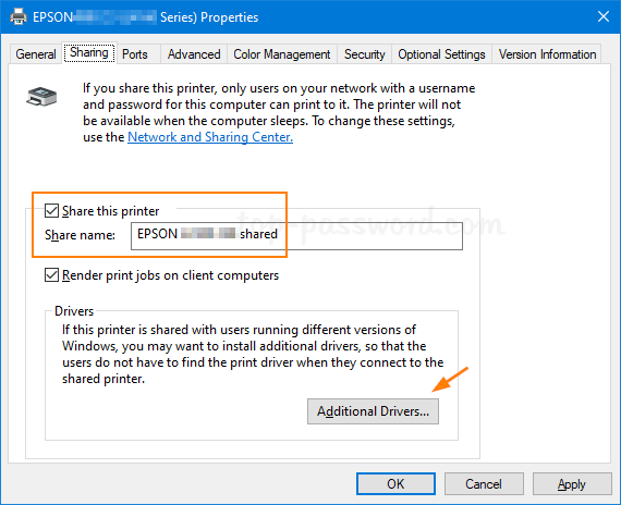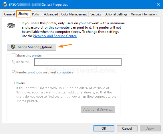 - 当打印机属性窗口打开时,选择分享选项卡。如果所有选项均呈灰色,请单击“更改共享选项“ 按钮。