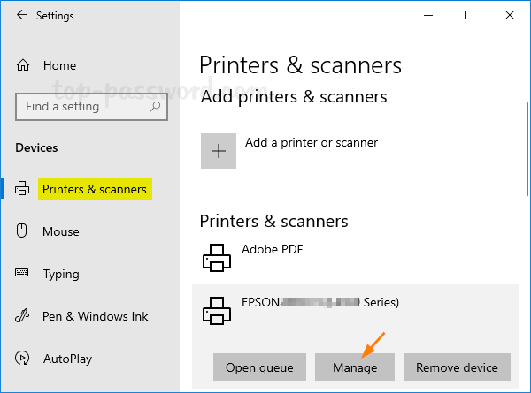- 按赢+我打开“设置”应用程序的键盘快捷键。导航至设备->打印机和扫描仪。在右侧选择要共享的打印机,然后单击管理按钮。