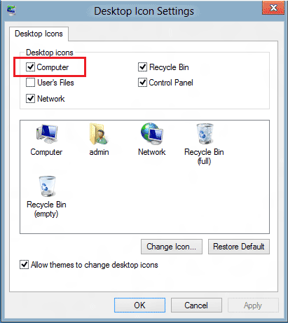 步骤3:在这里,在桌面图标部分下,打勾电脑复选框,然后单击申请按钮以在桌面上显示计算机图标。您还可以从此处显示/隐藏回收箱,网络和控制面板图标。你完成了!