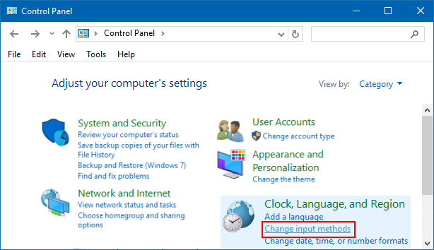 步骤 2:在控制面板中,单击更改输入法在时钟、语言和区域类别下。