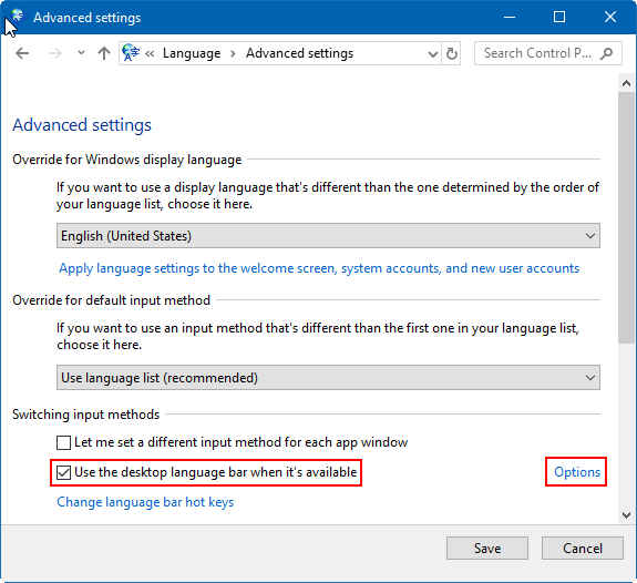 您可以使用语言栏在使用不同键盘布局的语言之间切换。如果您想摆脱语言栏或输入指示器,只需关闭输入指示器开关即可。