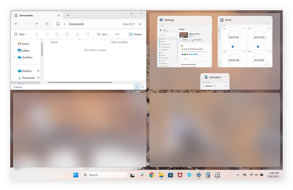 如果您使用的是 Windows 11,还有另一种方式来分割屏幕。该功能称为“对齐布局”,旨在帮助您以更大的灵活性组织计算机打开的应用程序和窗口(最多六个窗口,具体取决于您的屏幕尺寸和分辨率)。