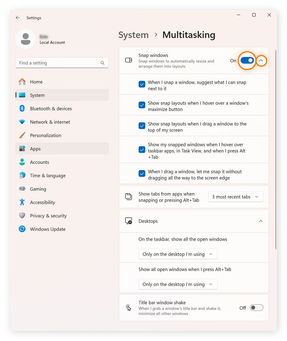 您还可以准确自定义 Snap 的行为方式 - 例如它是否显示布局建议或自动调整窗口大小。