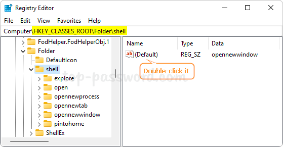 HKEY_CLASSES_ROOT\Folder\shell。寻找“(默认)”条目。如果其值数据不为空,则双击它。