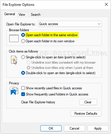 - 在“浏览文件夹”部分下,选择“在同一窗口中打开每个文件夹“ 选项。