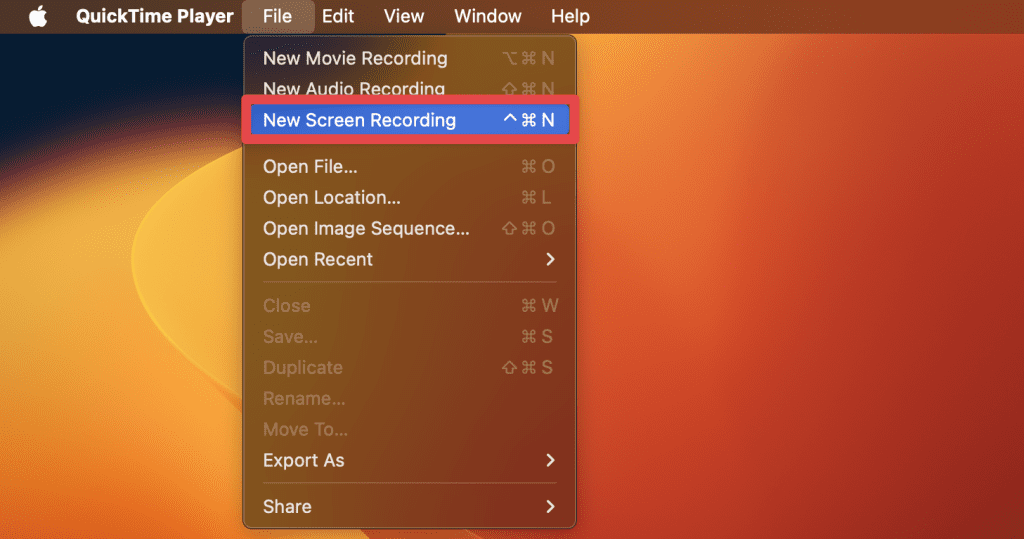 - 点击文件在菜单栏中并选择新屏幕录制。