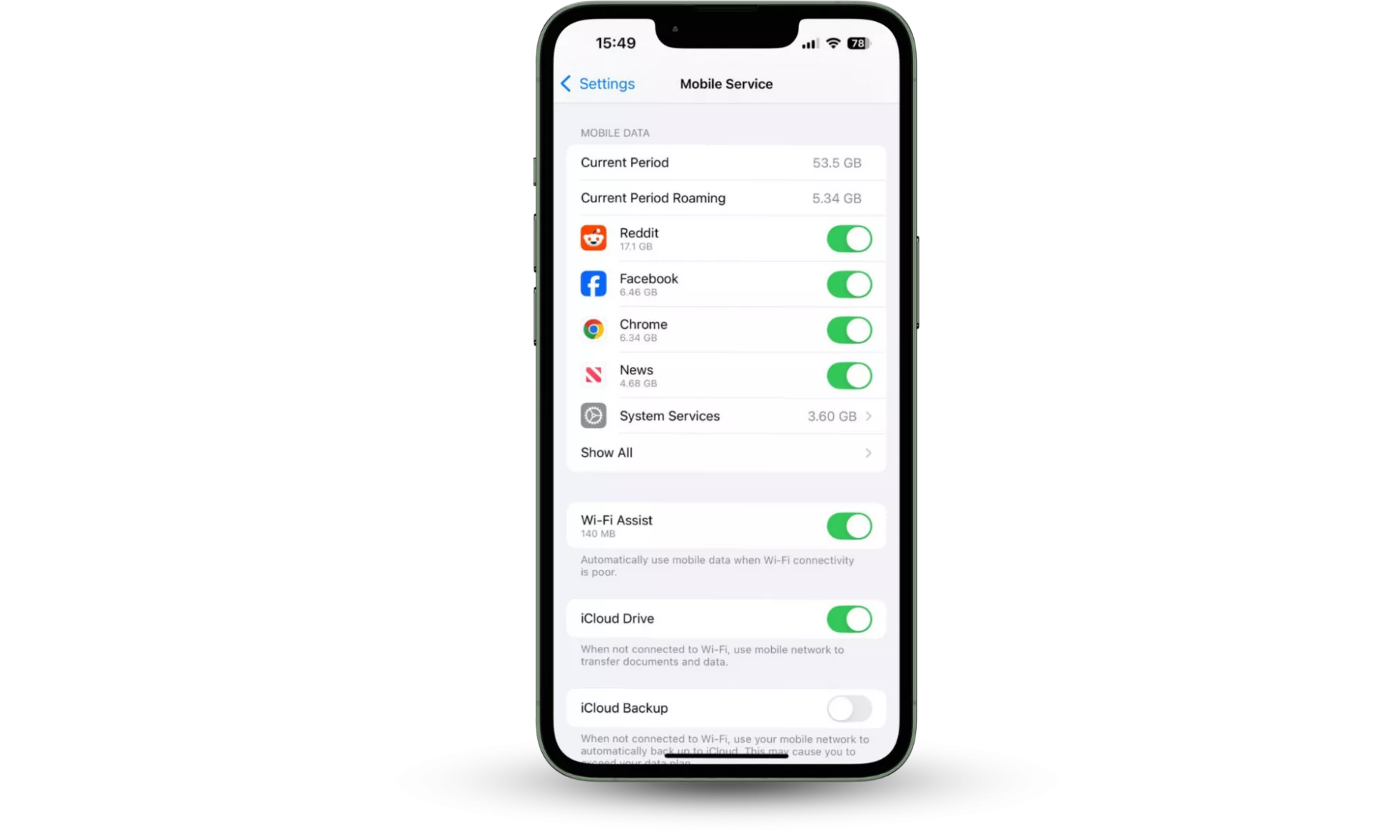 - 如果您使用 iPhone,请访问设置 > 移动服务(这可以称为蜂窝网络在某些地方)。向下滚动到移动数据。