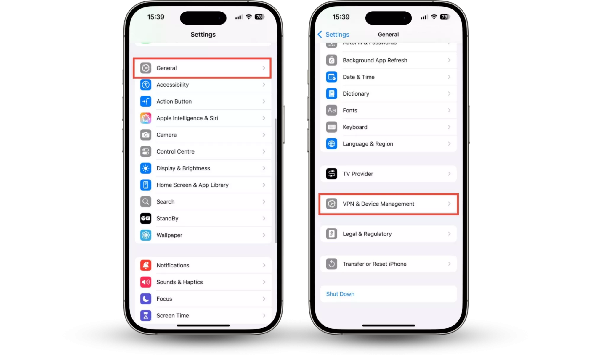 步骤 1-2:设置 > 常规 > VPN 和设备管理 > 删除配置文件