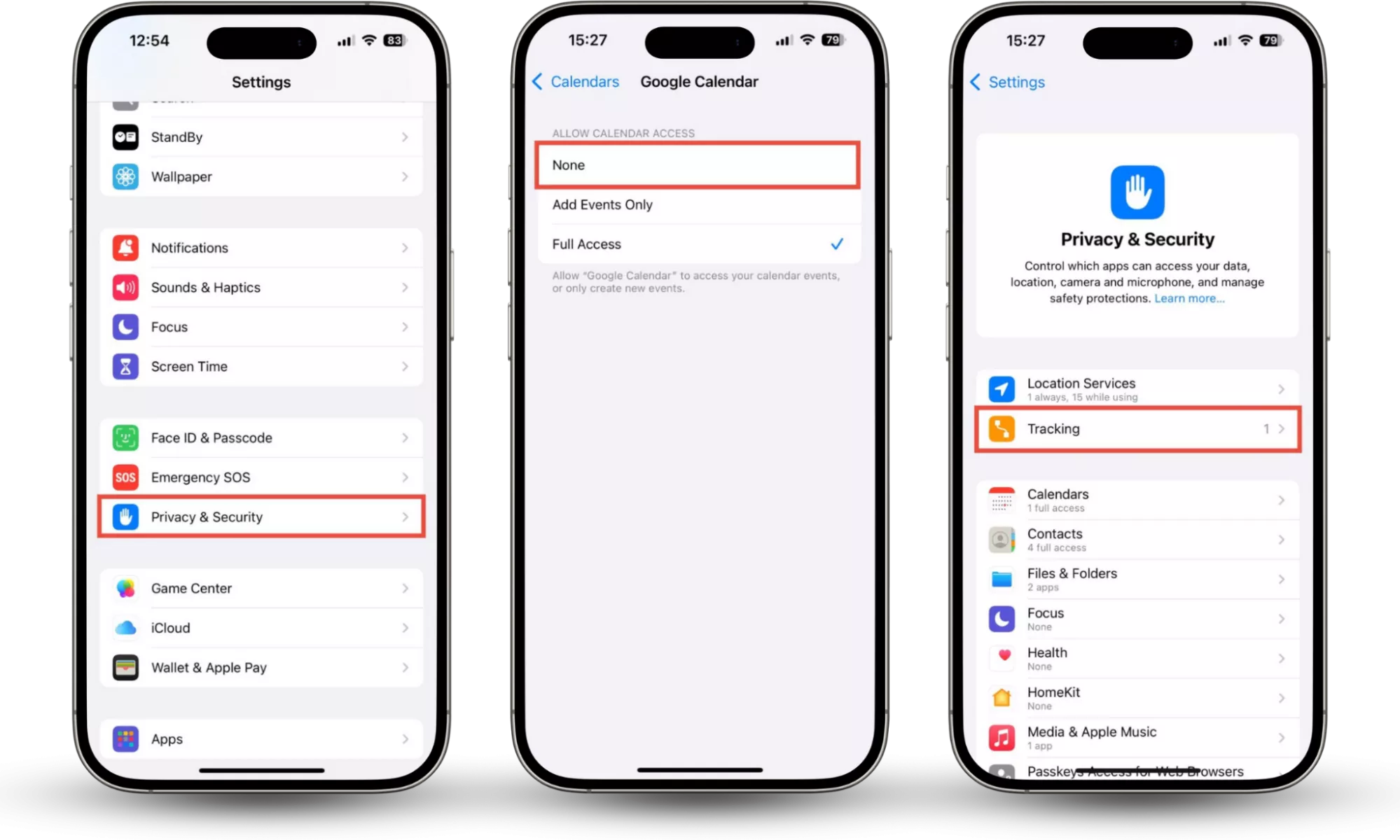 步骤 1-3:设置 > 隐私和安全 > 选择功能 > 选择应用程序 > 禁用 > 跟踪 > 检查设置