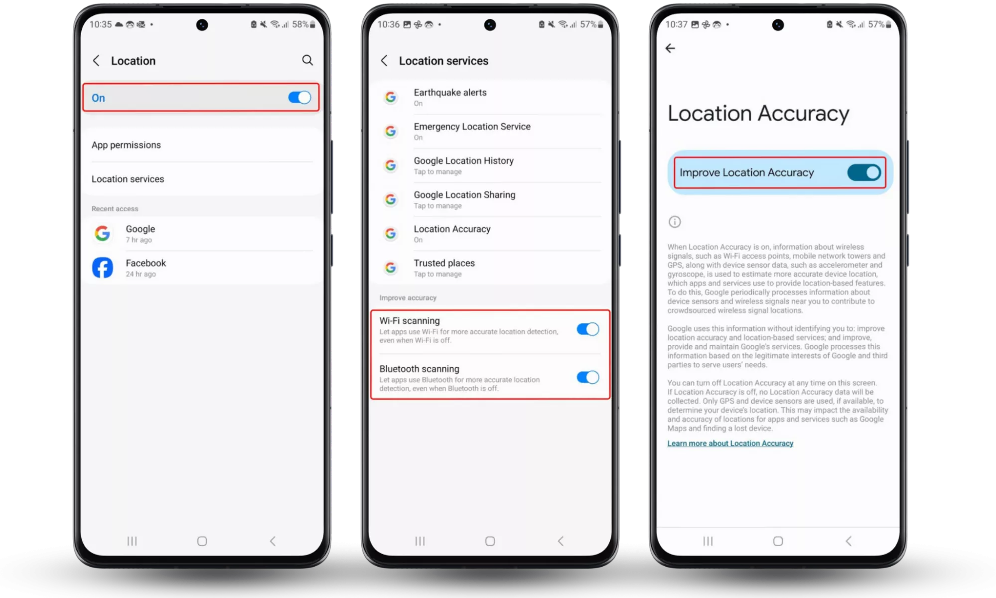 步骤 1-3:设置 > 位置 > 位置关闭 > 位置服务 > 禁用 Wi-Fi 扫描和蓝牙扫描 > Google 位置历史记录 > 关闭 > 返回 > 位置精度 > 禁用