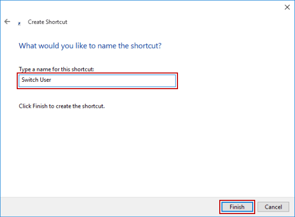 步骤3: 类型切换用户在名称框中,然后选择结束创建此快捷方式。
