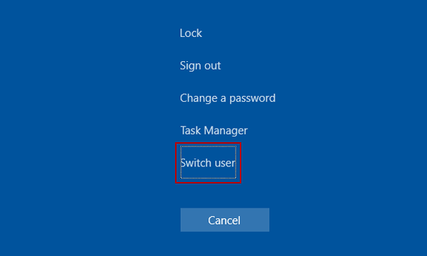 您还可以同时按 Ctrl + Alt +Del 键来获得切换用户选项,如下所示。然后单击“切换用户”,您将进入 Windows 10 登录屏幕。