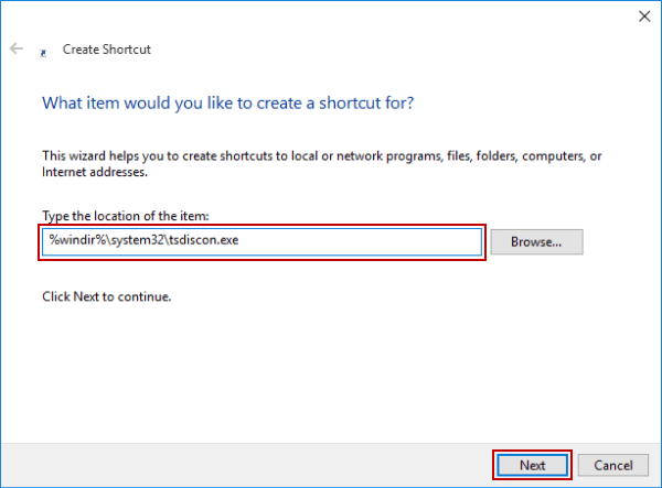 步骤2: 进入%windir%\system32\tsdiscon.exe并击中下一个在创建快捷方式窗口中。