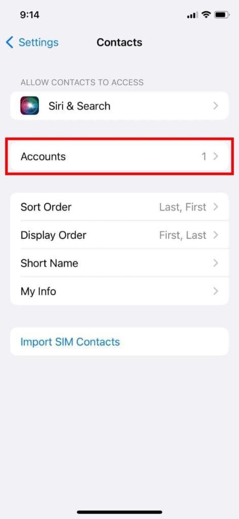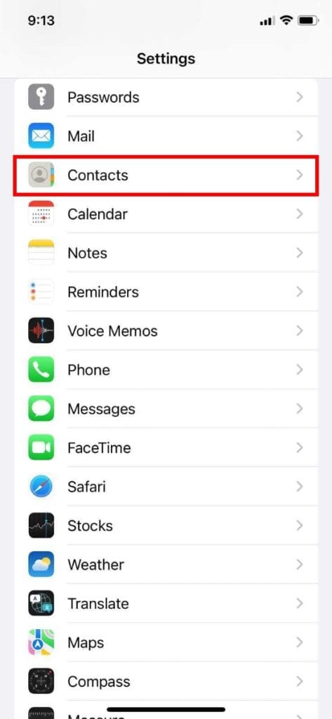 - 在您的 iPhone 上,转至设置并选择联系方式。