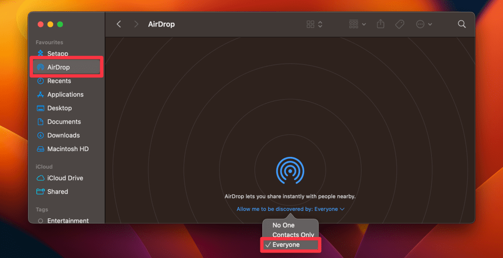 b.在苹果机上: 打开发现者>空投>让我被发现>每个人。