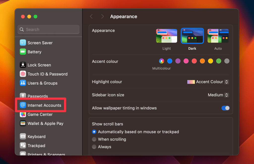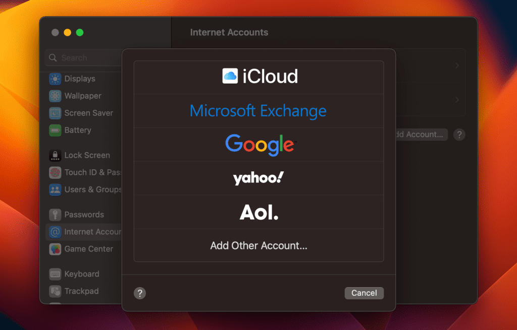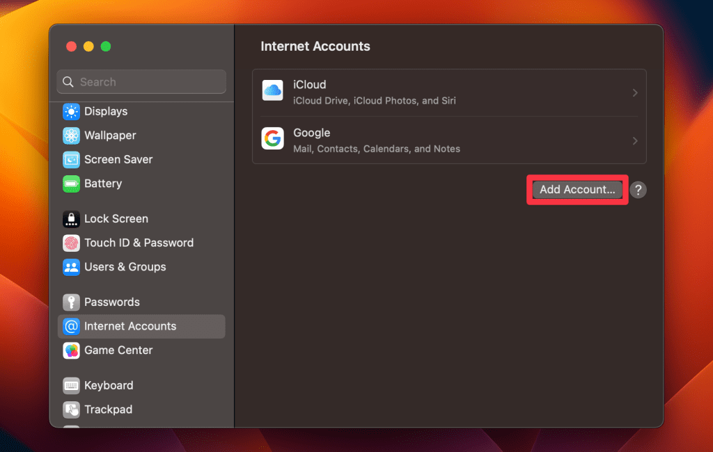 - 在互联网帐户下,您可能会看到您的 Google 或 Microsoft 帐户。如果没有,您可以通过单击添加它们添加账户按钮。