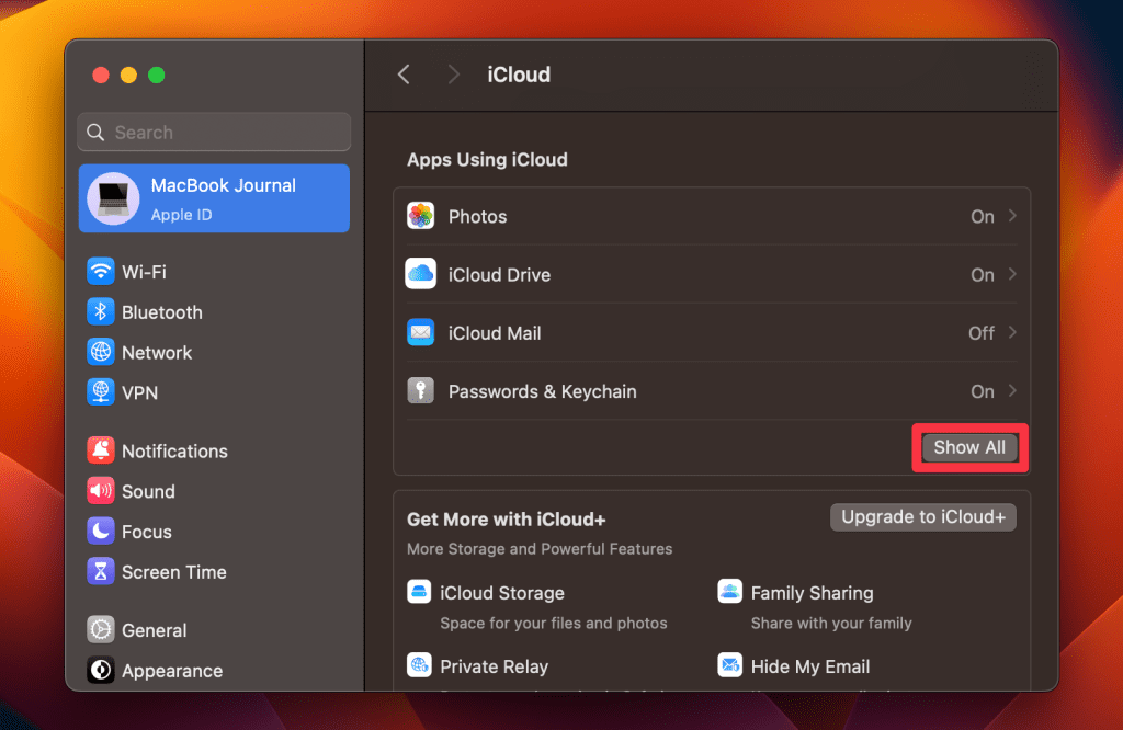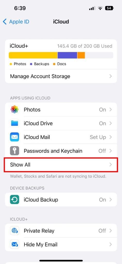 - 单击显示全部使用 iCloud 的应用程序部分下的按钮。