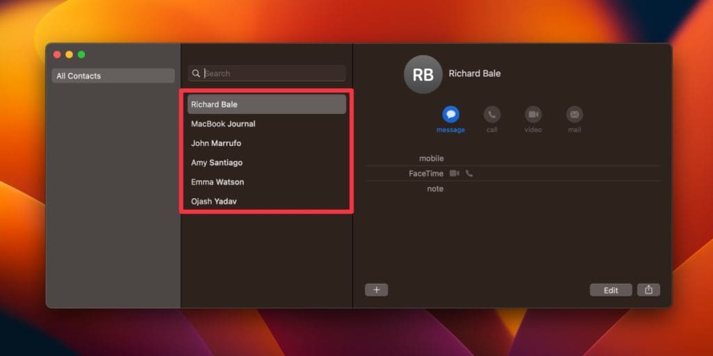 - 打开联系方式您的 Mac 上的应用程序,您的联系人就会在那里。
