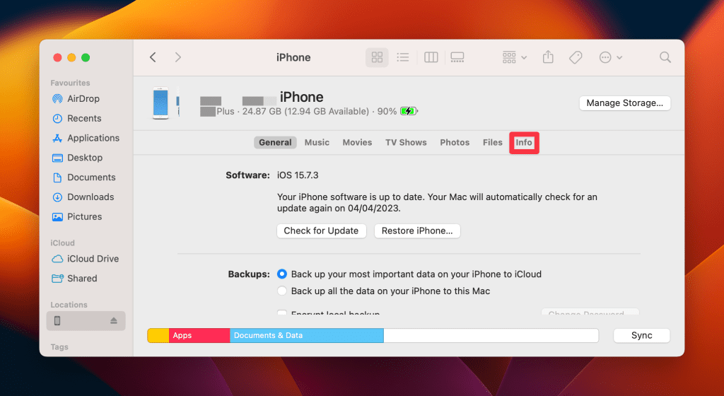 - 单击信息您的 iPhone 名称下菜单中的选项卡。