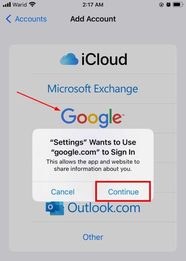 - 选择谷歌从列表中然后点击继续在弹出窗口上。
